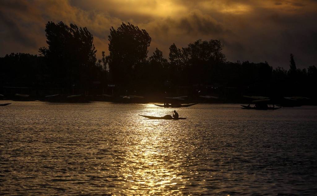 印控克什米尔夏季首府斯利那加,日落时分,印度游客在达尔湖拍照。