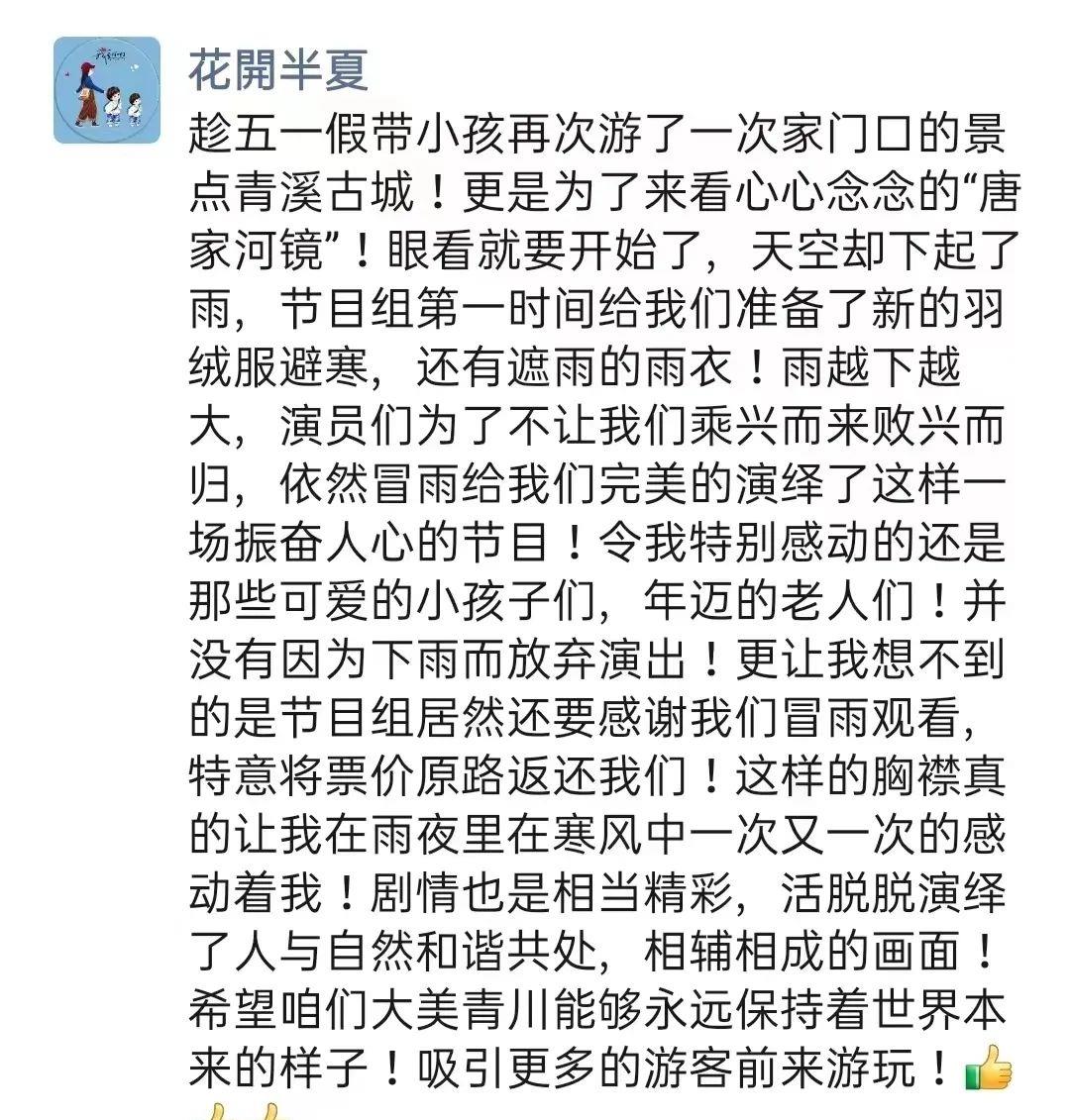 对于剧组在雨中的表现和暖心的举动,观众在演出中和演出后都在台上发了一条朋友圈为他们点赞。“为了不让我们带着好心情来,失望回来,演员们冒着雨表演,还第一时间为我们准备了棉衣和雨披,演出结束后全额退票。”游客张女士告诉记者。平时工作忙,这次趁五一假期带家人朋友去看演出。没想到遇到了突如其来的大雨,更没想到就这样跟随并收获了剧组的温暖。优先治疗心脏。