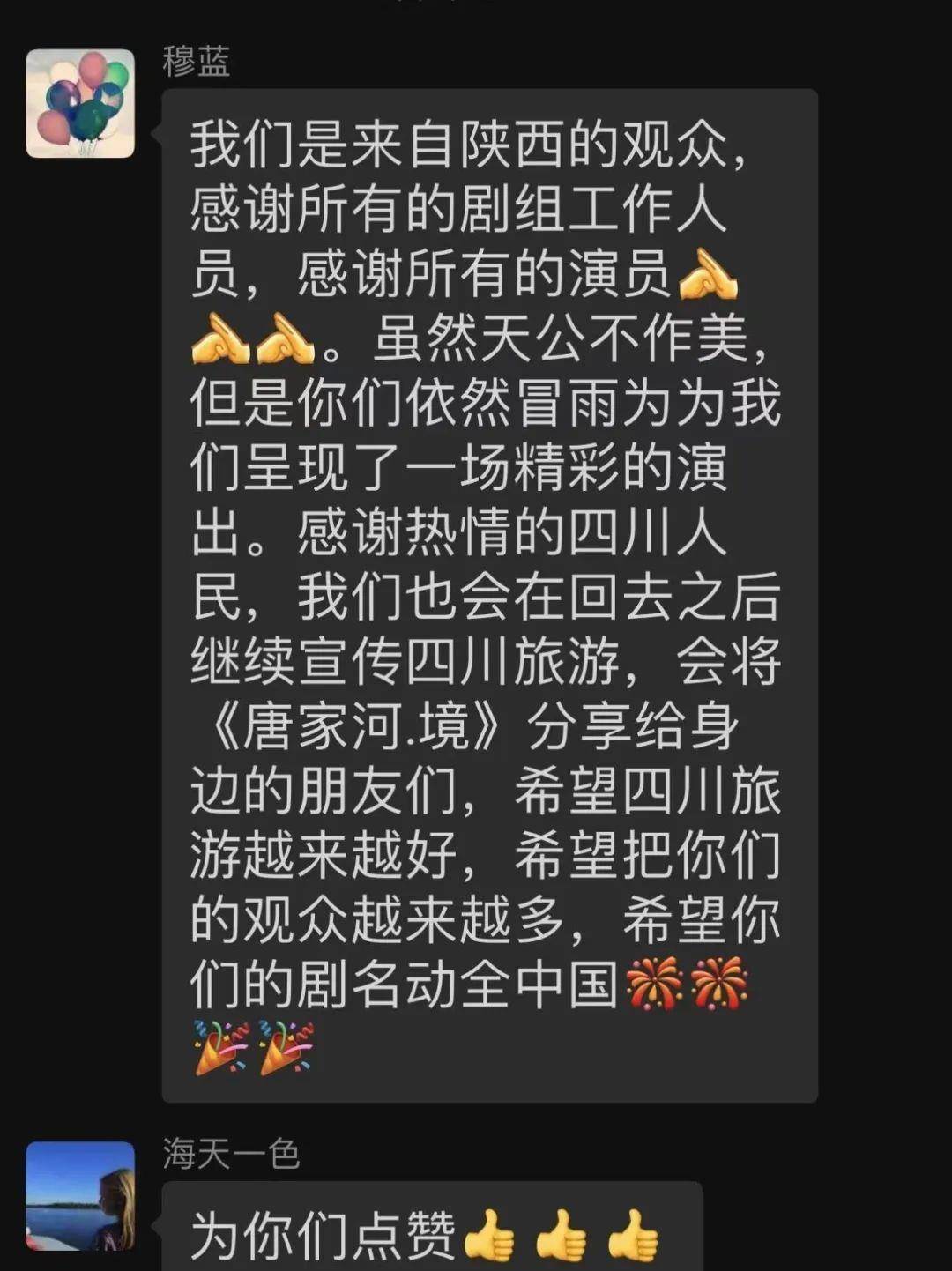 “我是陕西的观众,虽然天气不佳,但演职人员冒着雨给我们带来了精彩的表演,感谢热情的四川人,回国后我们会继续宣传四川旅游,我要把这个游戏分享给我的朋友们,希望四川的旅游业越来越好,这个游戏会红遍全国!”游客穆兰说。