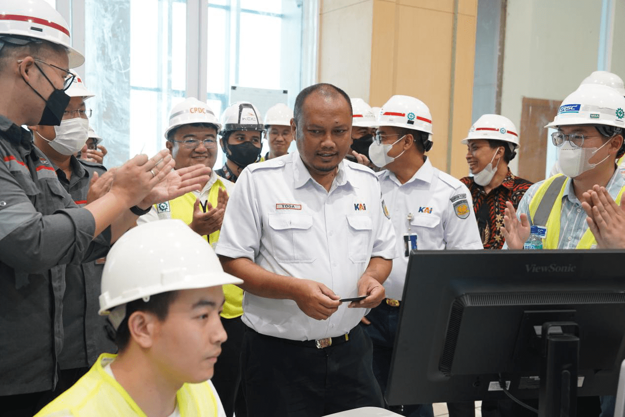 5月8日,在雅万高铁调度大厅,KAI公司IT部门负责人Albertus indarka wiyogo与员工共同见证首张客票打印成功。经济日报驻雅加达记者陈小方摄