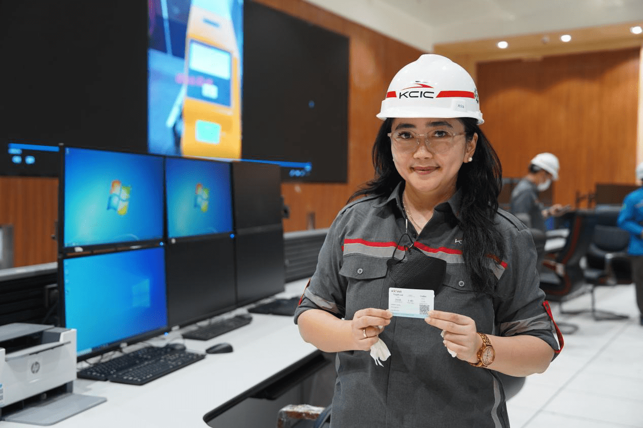 5月8日,在位于万隆的雅万高铁调度大厅,KCIC客票系统负责人Lenny收到印有自己名字的样票。经济日报驻雅加达记者陈小方摄。