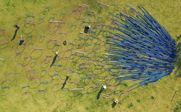 5月9日,在杭州运河亚运公园花溪坪,“春·笙”大地艺术装置正式发布,舞者们在数百根竹片和竹圈间起舞,宛若一幅奔腾不息的钱江潮涌画卷,吸引了不少市民置身“潮”中。据艺术家介绍,“春·笙”创作的灵感来源于杭州亚运会会徽的“潮涌”图形,象征了浙江人“勇立潮头”进取精神,蕴含竞技逐浪的体育精神。而将作品放置在亚运公园里,则是对杭州亚运会的致敬,对体育精神的回应。