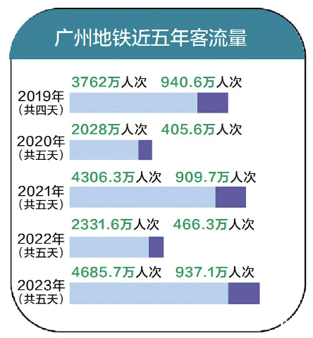 将对比数据拉长到五年,广州今年“五一”假期的日均客流量是去年(466.3万人次)的两倍,接近疫情前2019年(940.6万人次)的水平。