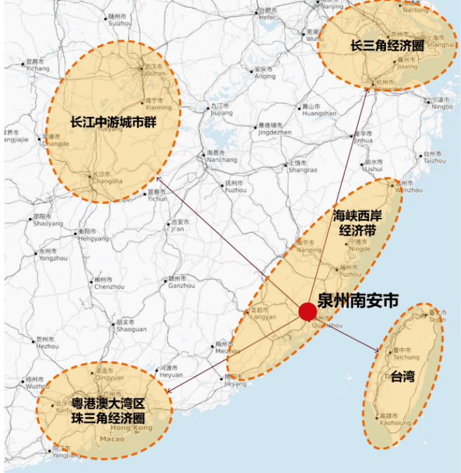 海峡西岸经济带是以福建省为主体,包含周边地区,南北与珠三角、长三角两个经济区衔接,东侧与台湾岛、西侧与长江中游城市群(武汉、长沙、南昌)联通,是集经济、文化政治、社会等各个领域的综合性概念区域。