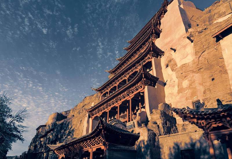 莫高窟位于敦煌市区以东25公里的鸣沙山下,是一个古代佛教艺术宝库,保存着中国最大、最丰富、最完整的佛教艺术瑰宝,其中还包括一些与印度、波斯等国文化交流的艺术珍品。