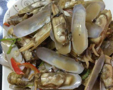 辣炒蛏子,这道菜做起来不麻烦,就是跑了好久,还换了四次水,就怕大家吃到沙子,好在味道很不错,葱,姜,干辣椒,花椒粉,爆锅,放入蛏子,直接盖锅盖,大概3分钟的样子口就全开了,加入点香菜,味精,稍微翻下,就0k了!