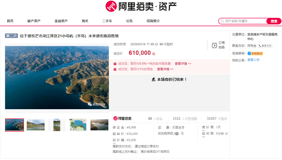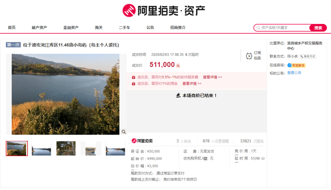 同年3月,位于德宏傣族景颇族自治州芒市龙江库区的21个小岛屿被竞拍138次,经过60次延时,以61万成交。