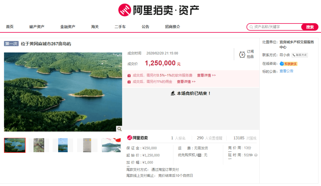 仅隔五天,又有位于黄冈麻城市的267亩岛屿拍卖,以125万成交。