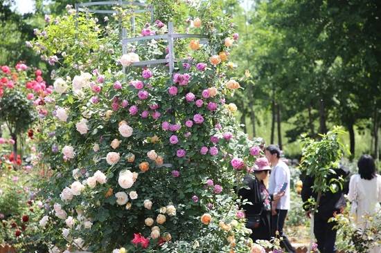 在工作人员的精心呵护下,初夏时节,园内红的、白的、粉的月季花墙、花廊、花柱、花球及不同规格的树状月季竞相绽放,散发出阵阵清香、沁人心脾,市民群众拿起手机、相机纷纷拍照,舒适的环境、美丽的鲜花,让每个游园的人都心旷神怡,流连忘返,沉醉在这花的海洋中……