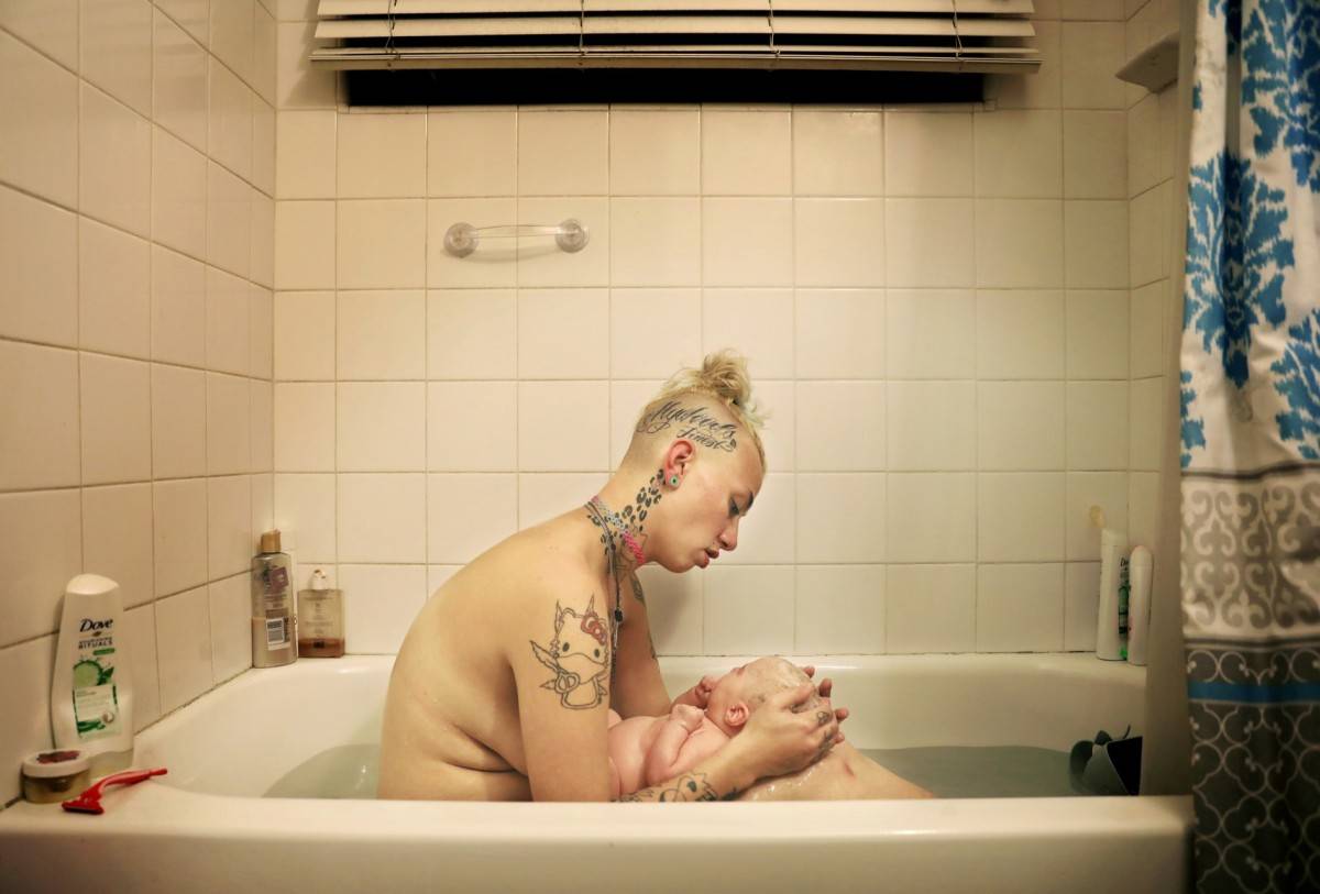 麦肯齐在阿灵顿高地(Arlington Heights)的家中给女儿安洗澡。