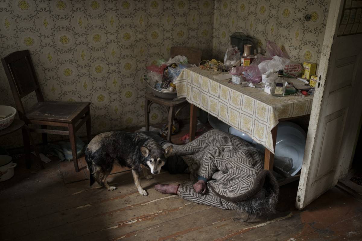 2022年4月5日,乌克兰基辅郊区,布查。一只狗站在一具老年妇女尸体旁边。费利佩·达纳(Felipe Dana) 摄