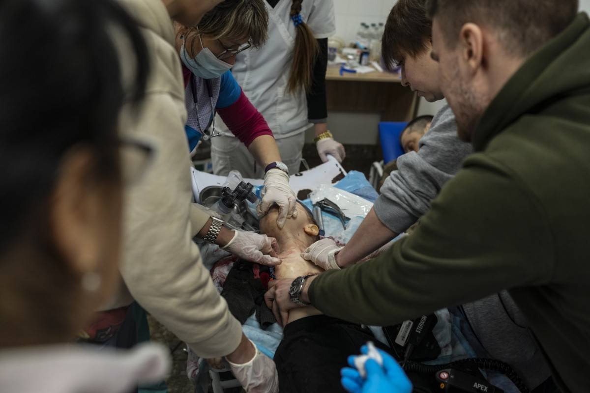 2022年3月4日,在乌克兰马里乌波尔的一家医院,医护人员试图挽救玛丽娜·亚茨科(Marina Yatsko)18个月大的儿子基里尔(Kirill)的生命,但没有成功。基里尔在炮击中受了致命伤。叶甫根尼·马洛莱特卡(Evgeniy Maloletka) 摄