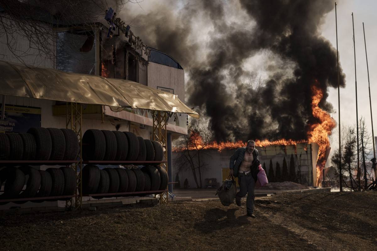 2022年3月25日,乌克兰哈尔科夫。俄军发动袭击,一名男子从燃烧的商店里取回物品,转身奔跑而出。费利佩·达纳(Felipe Dana) 摄