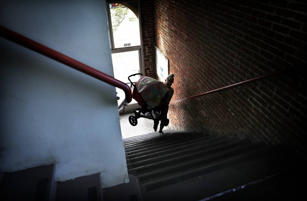 麦肯齐用婴儿车抱着安上楼,去他们的公寓。