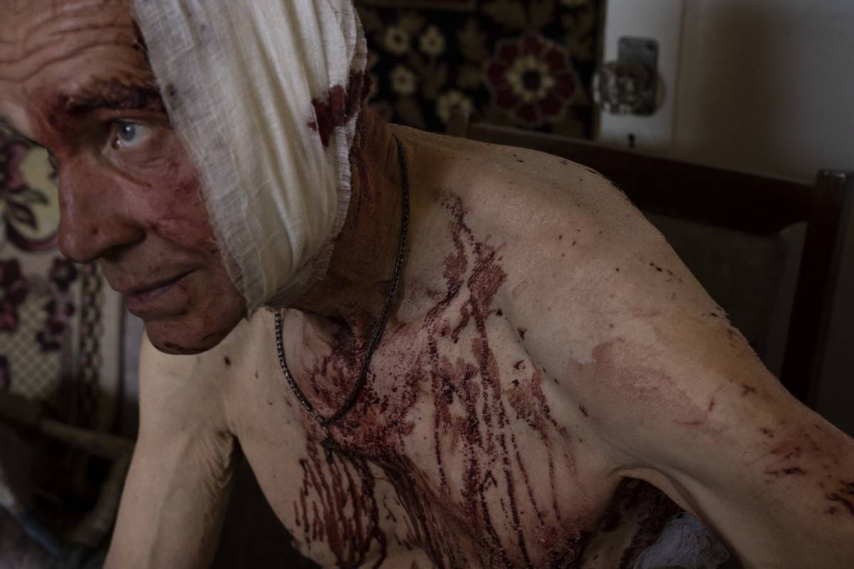 2022年7月7日,乌克兰东部顿涅茨克地区克拉马托尔斯克。66岁的沃洛德米尔(Volodymyr) 在袭击中受伤,他坐在受损公寓的椅子上。纳里曼·埃尔·莫夫蒂(Nariman El Mofty) 摄