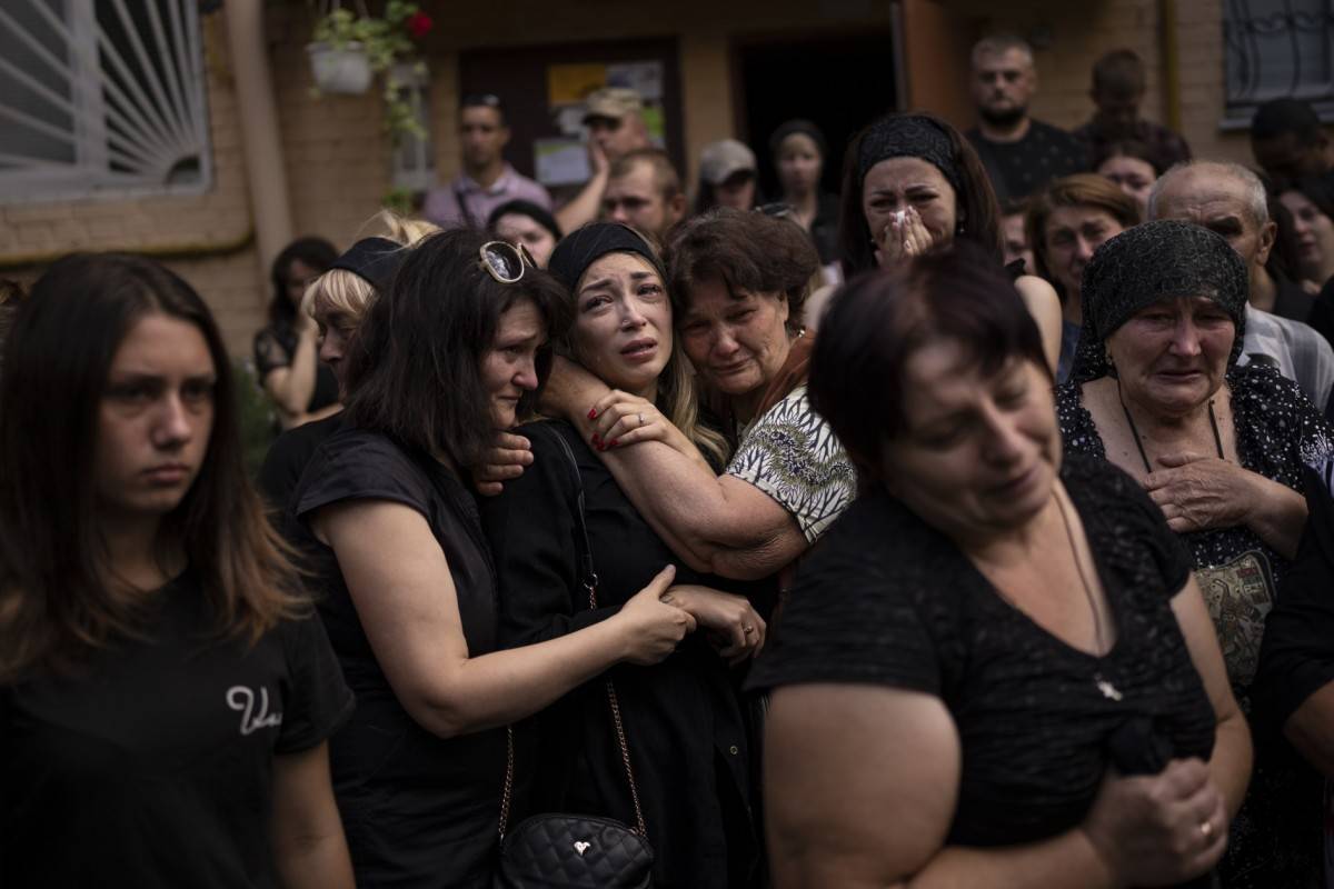 2022年8月31日,在乌克兰布查举行的一场葬礼上,26岁的阿纳斯塔西亚·奥里缅科(Anastasia Ohrimenko)在丈夫尤里·斯蒂格柳克(Yury Styglyuk)的棺材旁哭泣,亲友安慰她。埃米利奥·莫雷纳蒂(Emilio Morenatti) 摄