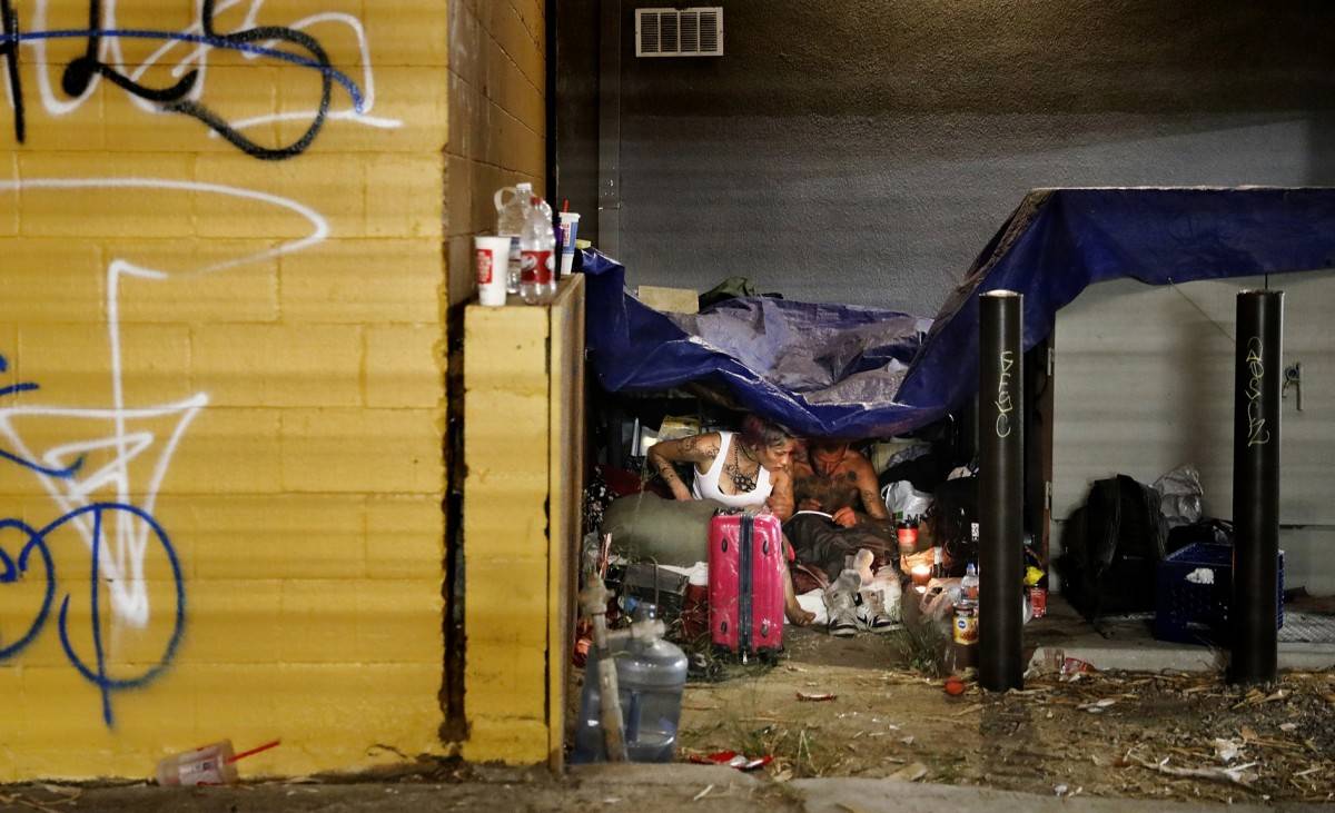 麦肯齐和艾迪坐在好莱坞一条小巷的篷布下。