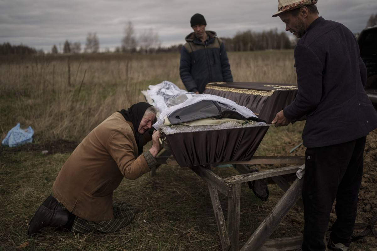 2022年4月16日,乌克兰基辅郊区米库利奇(Mykulychi)公墓。70岁的纳迪亚·特鲁布查尼诺娃(Nadiya Trubchaninova)跪在装着她48岁儿子遗体的棺材旁哭泣。在得知儿子被撤退俄军杀害,并被埋葬在布查的一个院子里后,她花了一个多星期的时间试图把他带回米库利奇的家中,找一个合适的坟墓。罗德里戈·阿布德(Rodrigo Abd) 摄