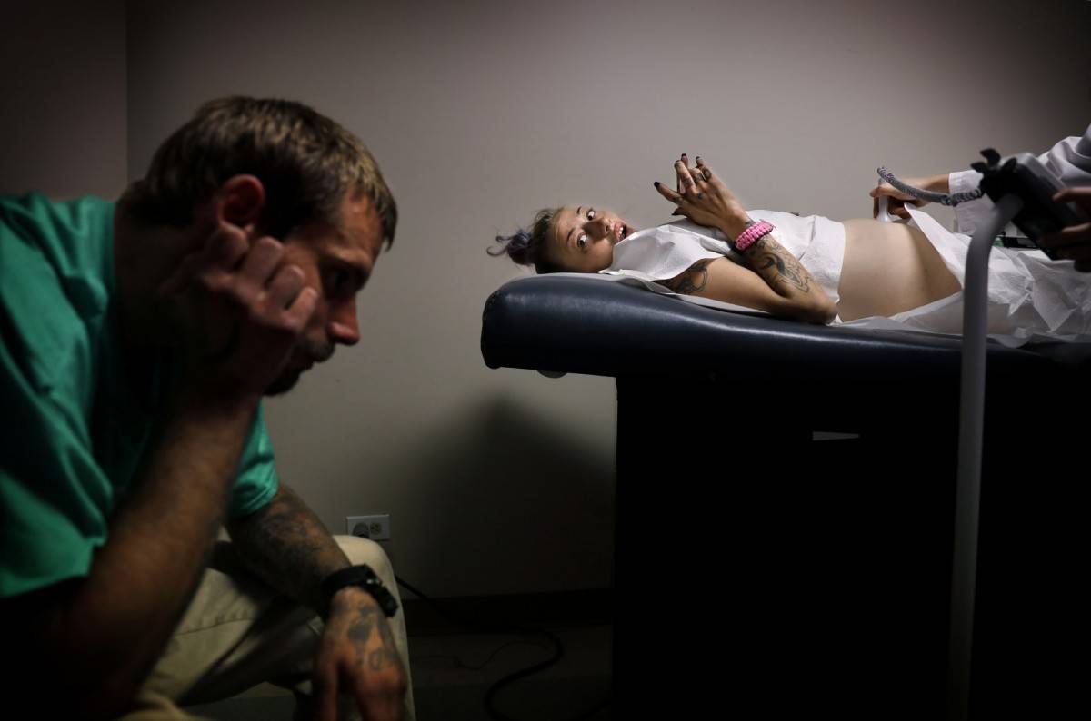 23岁的麦肯齐在洛杉矶怀特纪念医院(White Memorial Gynecological and Obstetrical Medical Group)听到孩子心跳时,回头看着她27岁的男友艾迪。艾迪低头看着地面,闭上眼睛,用手撑着头。