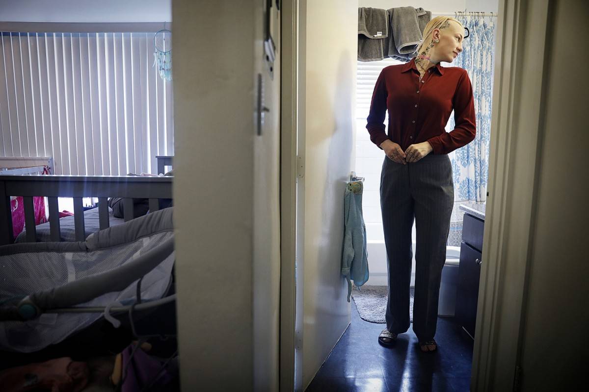 麦肯齐在阿灵顿高地(Arlington Heights)的公寓里穿好衣服去面试。一家当地组织给她提供了一套职业装。