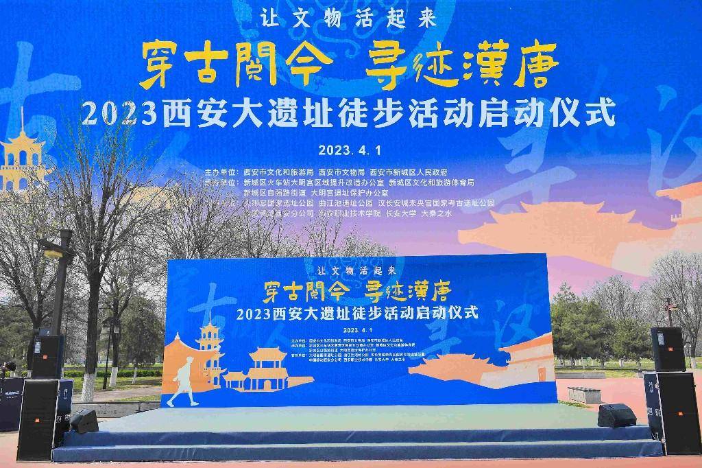 三秦都市报-三秦网讯(记者 夏明勤)为深入贯彻西安市委、市政府“打造彰显中华文明的世界人文之都”要求,守护好历史文化遗存,传承好中华文明和历史文脉,讲好西安故事,全方位展现古都遗址文化魅力。4月1日下午,由西安市文化和旅游局、西安市文物局、新城区政府联合主办,新城区火车站大明宫区域提升改造办公室、新城区文化和旅游体育局、新城区自强路街道联合承办,大明宫国家遗址公园、曲江池遗址公园、汉长安城未央宫国家考古遗址公园、中国移动西安分公司、西安职业技术学院、长安大学、大秦之水作为支持单位的“穿古阅今,寻迹汉唐”2023西安大遗址徒步活动在大明宫国家遗址公园隆重启幕,曲江池遗址公园分会场徒步活动同步进行。西安市文化和旅游局、市文物局、新城区政府、中国移动西安分公司、西安职业技术学院有关领导出席了活动。