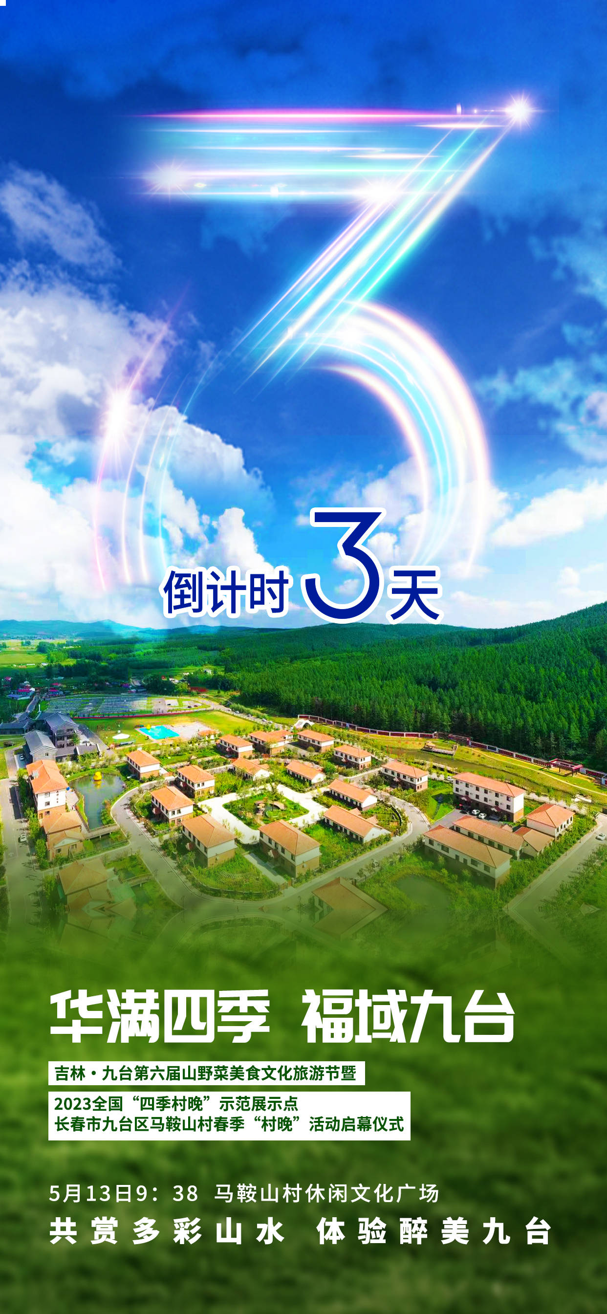 共赏多彩山水,体验醉美九台,5月13日,吉林·九台第六届山野菜美食文化旅游节暨2023全国“四季村晚”示范展示点长春市九台区马鞍山村春季“村晚”活动启幕仪式即将在马鞍山村休闲文化广场举办。