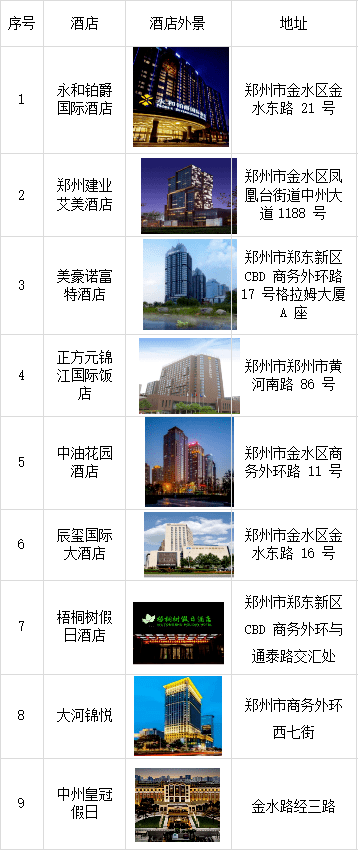 为了保证参展、参会代表及参观观众在“第七届郑州泵与电机展”开展期间,有一个方便、舒适的住宿环境,组委会选出郑州国际会展中心周边各星级酒店,供各位选择,具体信息如下。