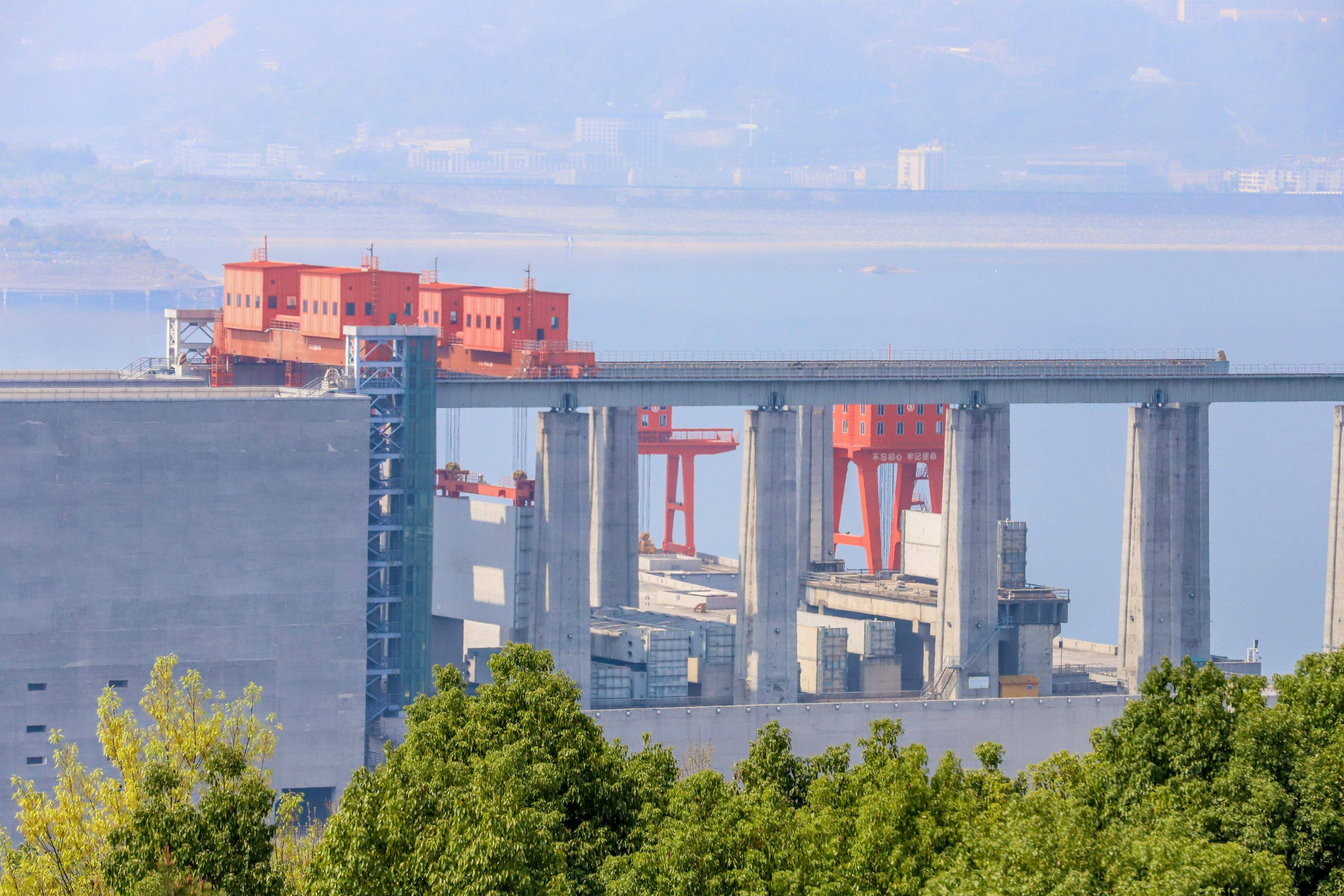 这个船闸是以左岸山体开挖而成的,是三峡水利枢纽的主要通航建筑物,最大开挖深度为170米,上下游水位最大落差是113米,可通过万吨级船队。
