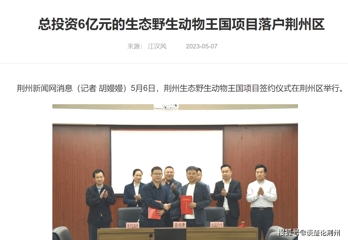 在荆州楚都野生动物园前景不明的时候,荆州区又发布了一则消息,荆州区跟武汉某公司签约,在八岭山镇投资6亿元建设野生动物王国。