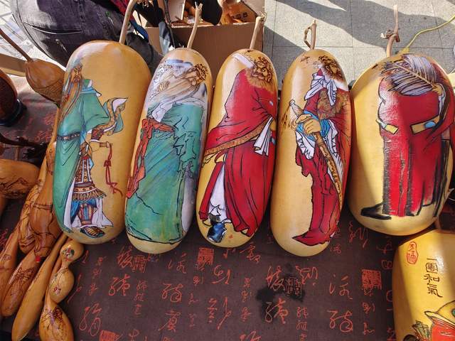“ 烙画葫芦大小不一、色彩艳丽。每一个葫芦上画着表情自然、神态各异的人物。个个花鸟栩栩如生,让人十分惊叹。葫芦烙画用电烙铁加热代替毛笔,运用雕刻、烙画等技法,把传统绘画、书法、图案在立体的葫芦上表现出来。