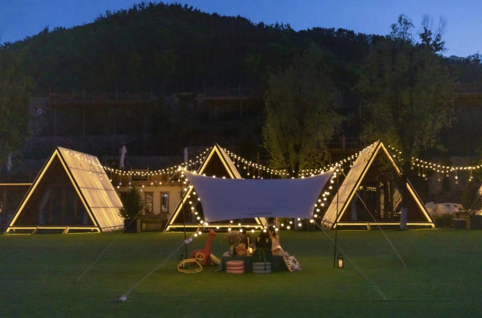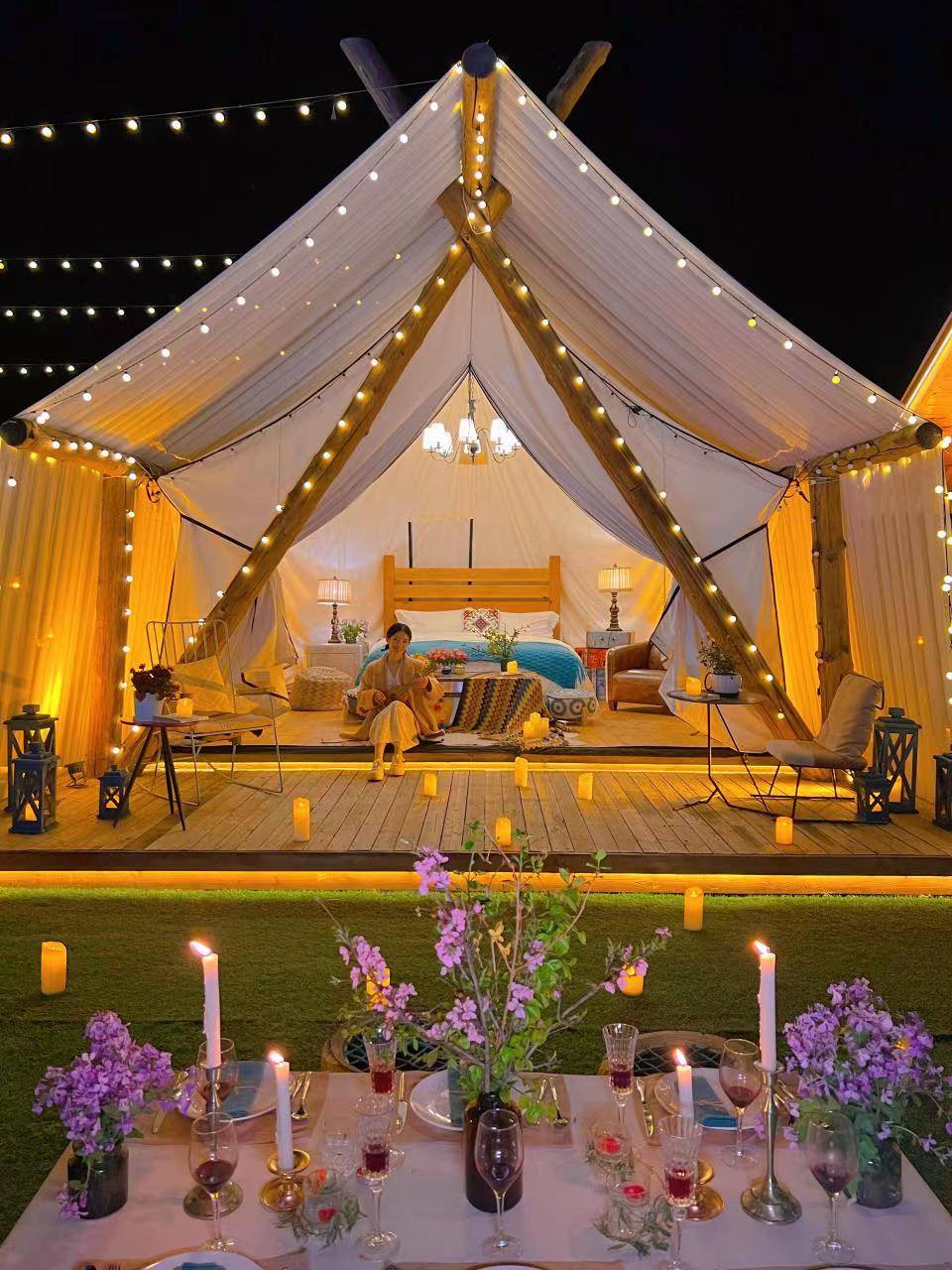 精致帐篷、复古摆件、梦幻纱幔…构成绝美画面。当天空呈现蓝调,迎来最佳出片时间,球泡灯围绕着帐篷,暖黄色的灯光氛围感满满!随手一拍都是大片!