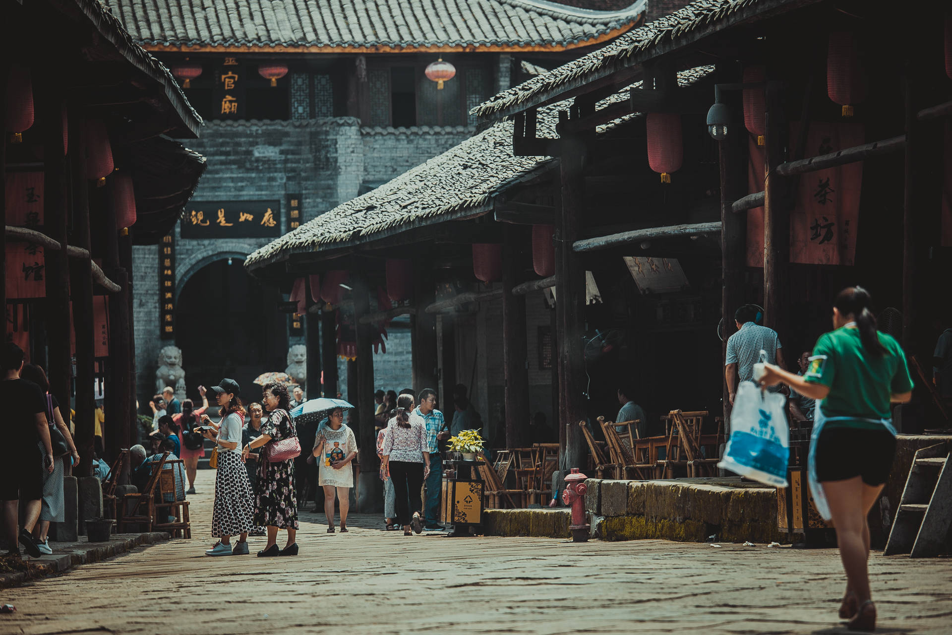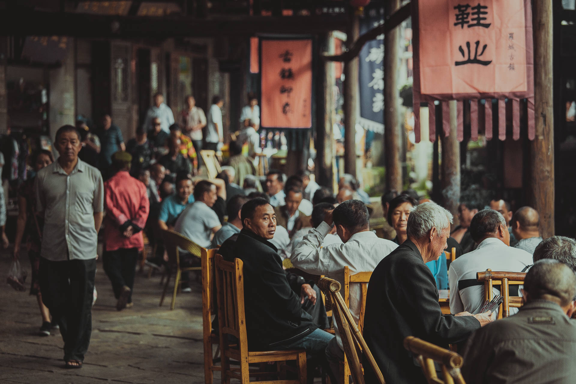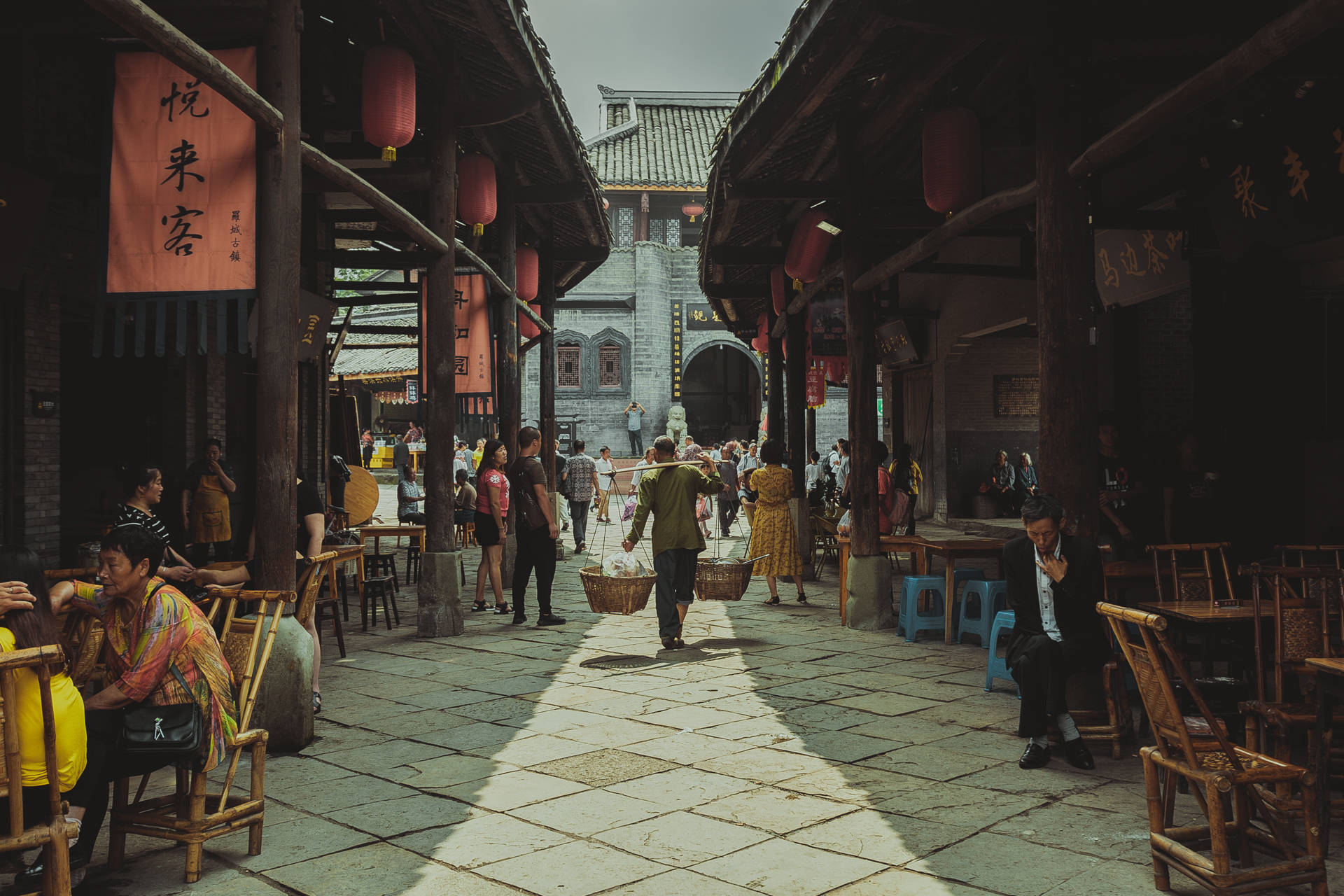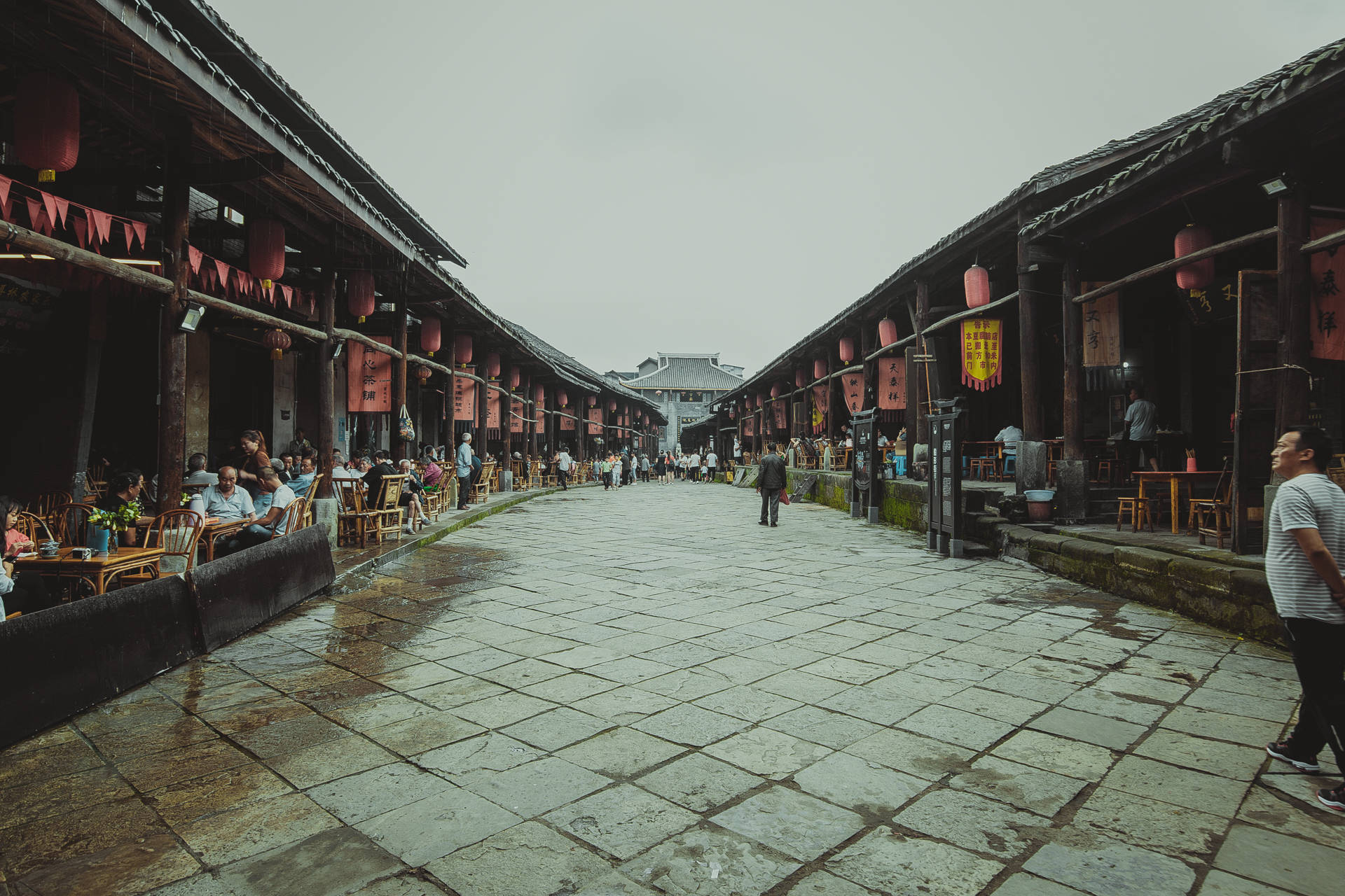 古镇最引以为傲的就是一条长 209米,最宽处 9.5米的青石板街道,叫做凉厅街,因其造型像船,所以也被人们形象的称为“船形街”,从高处往下看,就像一条巨大的船漂浮在大地之上,“山顶一只船、云中一把梭”,这条船也是中国目前唯一一条船形街道,在街道两旁是木结构的长排旧瓦屋,是典型的川西集镇建筑风格,400年来,一代又一代人就是在这“凉厅子”下喝茶、吃肉、饮酒、掏耳朵、摆龙门阵、看戏曲、做生意,真的是将“山间红尘享清福”展现的淋漓尽致。