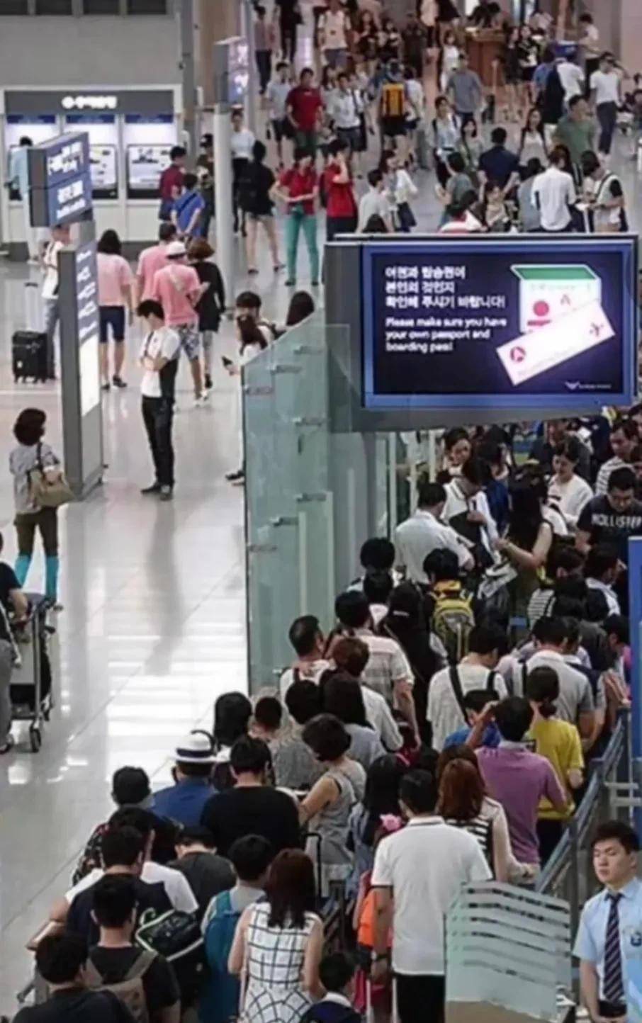 虽然这个七倍也遭到质疑,是怎么算出来的。但是,现实情况是韩国的仁川机场落地的中国人都是排着长队去坐电梯。排着长队去买饮料,排着长队去上厕所。