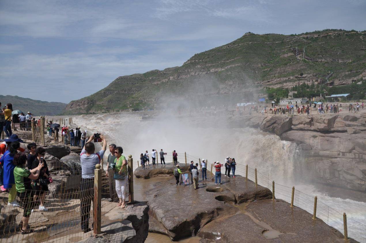 我看过的最令人心潮澎湃的黄河景观莫过于壶口瀑布。2018年同学聚会,我们相约来到陕北,走近了心仪已久的黄河壶口瀑布。这是世界上最大的黄色瀑布,大老远就能听到汹涌澎湃的河水轰鸣声。黄河在晋陕大峡谷里奔涌着,当排山倒海般的水流从千米河床拥挤到这只有二三十米窄的“龙槽”倾泄下去,便形成了气势磅礴雄伟壮观的壶口瀑布。我们站在右侧河边的岩石上,奔腾的河水溅起细细的水滴撒在脸上,凉丝丝的。“快看,那边出彩虹啦!”顺着碧芳手指的前方,随风飘移着的水雾中一道美丽的彩虹横跨在瀑布上方,令游客们惊叹不已,纷纷拿起相机、手机拍摄。我不禁想起了1997年香港回归时,柯受良驾车飞跃壶口瀑布的壮举,电视画面中那辆白色跑车从河东到河西那惊人的一跃,在涛涛黄河上划出了一道美丽的弧线,让全世界为之震撼!现场主持人朱军和吴莉莉同时把这动人心魄的一刻报道给全国人民和全世界海外华人。