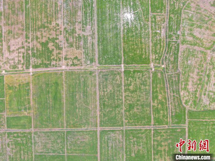 图为航拍一块块紧密相连的农田向远处延伸,大地绿意盎然。 刘力鑫 摄
