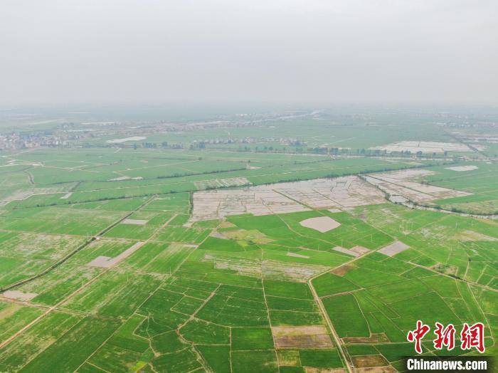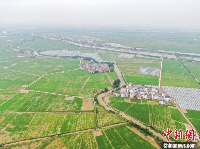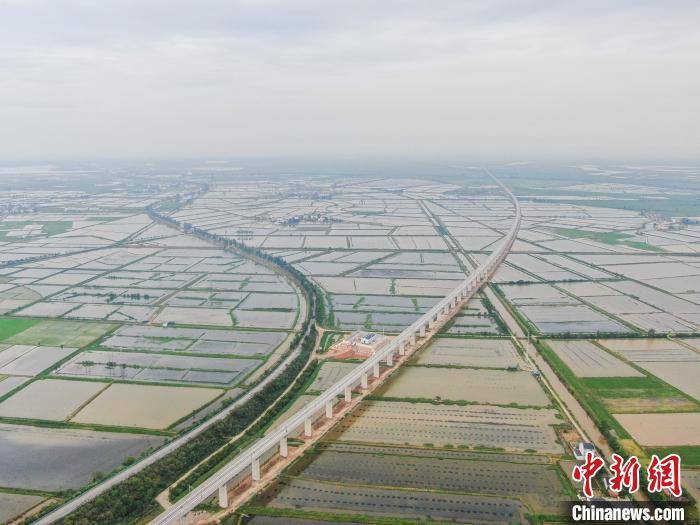 5月10日,航拍地处鄱阳湖畔的江西上饶余干县和鄱阳县的广袤田园,只见一块块紧密相连的农田绿意盎然,一个个水塘宛若明镜一般镶嵌在大地上,一栋栋民房错落有致分布,正在建设中的昌景黄高铁宛若一条长龙从田园之上飞跨而过,一幅秀美乡村画卷映入眼帘。