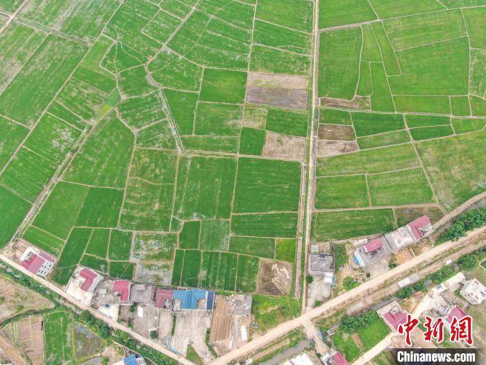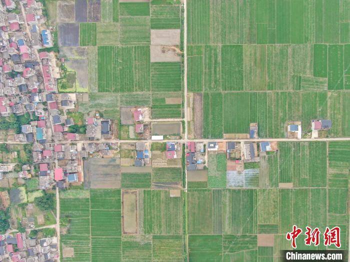 图为航拍广袤的田野绿意盎然,阡陌纵横,民房错落有致分布,风景秀美如画。 刘力鑫 摄