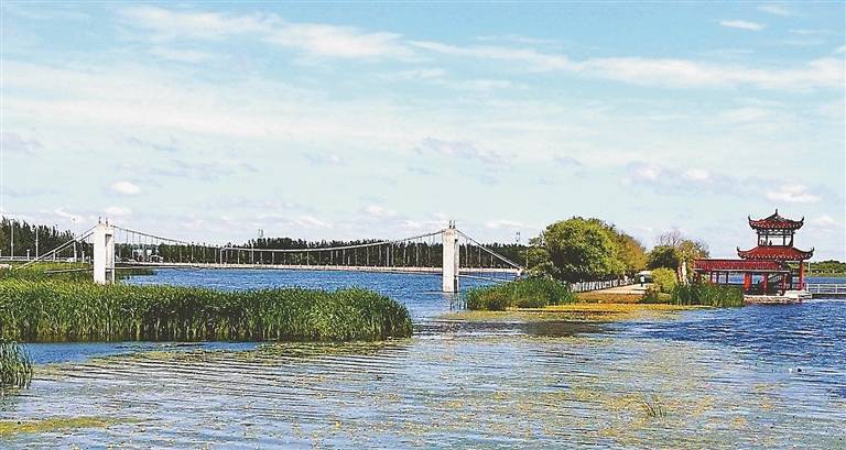 被这个发现惊艳到了,我忍不住赶紧走下亭榭,踏上白色栏杆、黄色桥板的连心桥,急着去时进岛上看个究竟。连心桥连着的是湖心的时进岛,用这个名字恰切又温暖。我小心翼翼地却是迈着快行的碎步,暂时顾不得眺望四周景色,直奔目标。