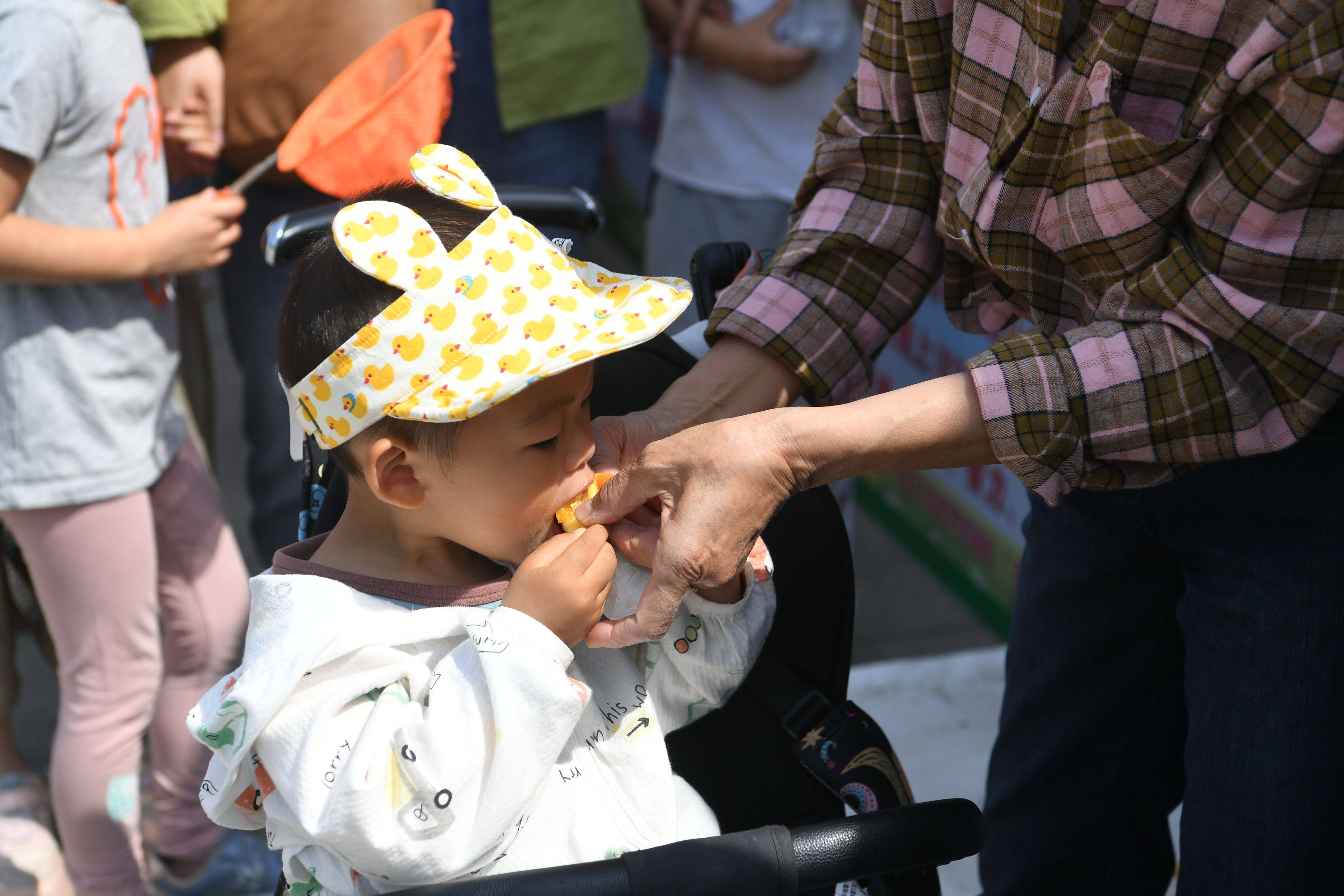 小朋友在品尝展出的农特产品。新京报记者 王颖 摄