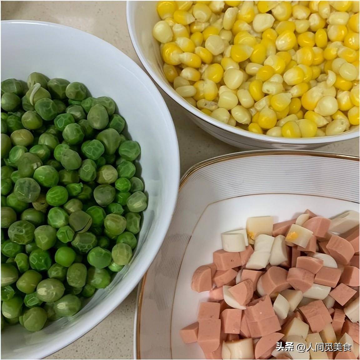 煎好一整根茄子后,秦大嫂又用空气炸锅炸了几个麻圆,小颗的麻圆看起来好精致,裹满了芝麻特别香,一口一个停不下筷子,而且没有用油更健康。当然还是有一个热菜,就是火腿肠丁玉米粒和豌豆搭配在一起炒,豌豆和玉米粒都是夏天趁便宜的时候买的,然后剥好放在冰箱里,这样想吃时随时拿出来就可以做菜,营养和口感还是一样的,又好吃还方便。