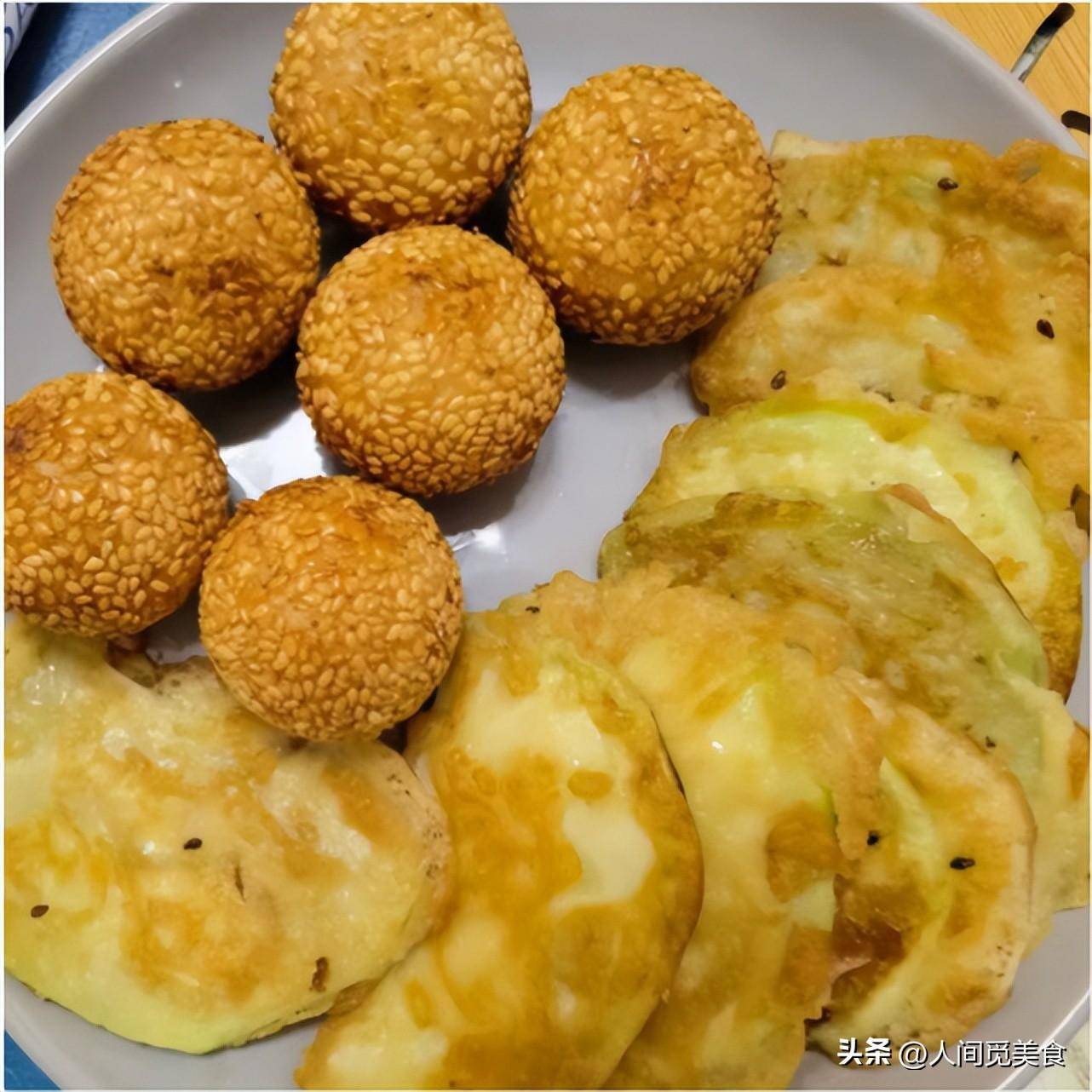 因为这个南瓜很甜,是那种老南瓜,绿豆又压得很耙,南瓜的香甜和绿豆的清香融合得很好,偶尔吃一顿这样的粗粮,还可以调节一下肠胃。除了这个粥之外,秦大嫂还做了茄盒,新鲜的茄子刮皮切片,然后裹一圈面糊,平底锅里刷一层油,把裹满了面糊的茄片煎到两面金黄,撒一点孜然,味道就出来了,别有一种香味。