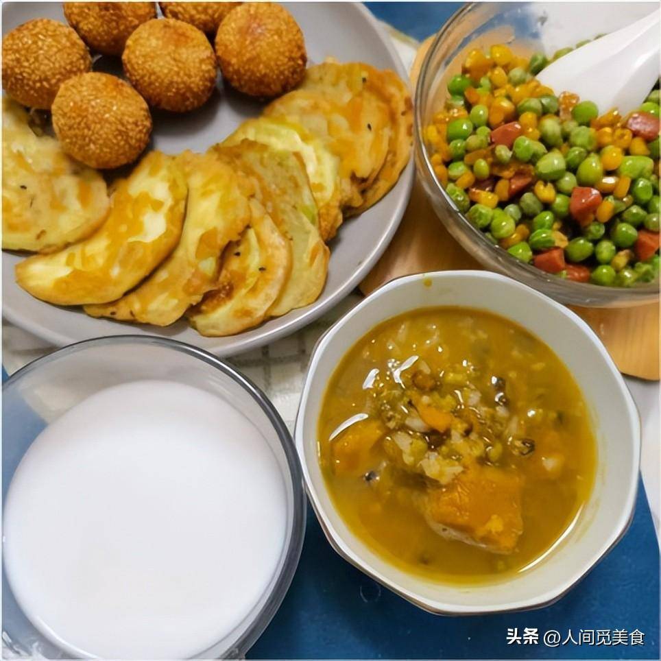 秦大嫂家的孩子爱吃火腿肠,所以冰箱里常备火腿肠,今天孩子们不在家,她就拿了一根淀粉肠切成丁,和玉米豌豆炒着吃,红红绿绿黄黄的颜色诱,几种食材混合在一起味道又很好,又香又有嚼劲,这样一个粥一个主食一个热菜,搭配得挺合理的。而且秦大嫂还热了牛奶,营养就更丰富了。