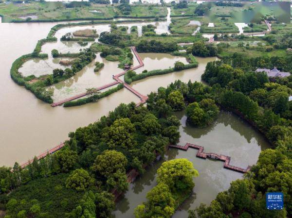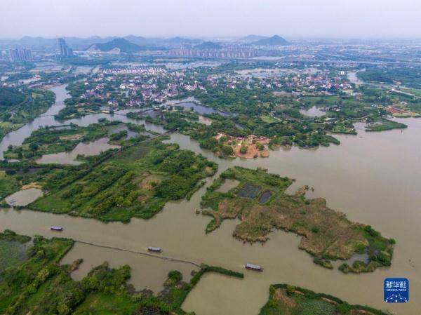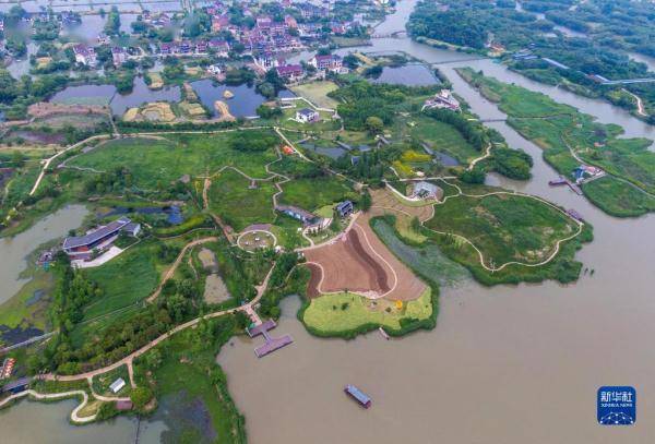 空中俯瞰位于德清县的下渚湖国家湿地公园(5月8日摄,无人机照片)。下渚湖国家湿地公园面积约为36平方公里,是国家AAAA级景区、省级风景名胜区、朱鹮易地保护暨浙江种群重建基地、国家野生大豆保护区、省级生态旅游示范区试点单位。