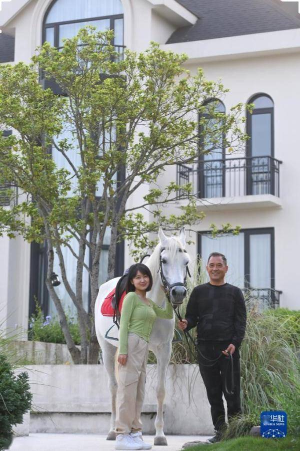 德清县莫干山镇高峰村的民宿主姚雪华(右)与女儿姚荪芳在民宿前(5月8日摄)。毕业于中国美术学院设计专业的姚荪芳在杭州工作多年后,回到家乡,自己动手设计,与父亲将老宅改造成了主题民宿“弥宫”。
