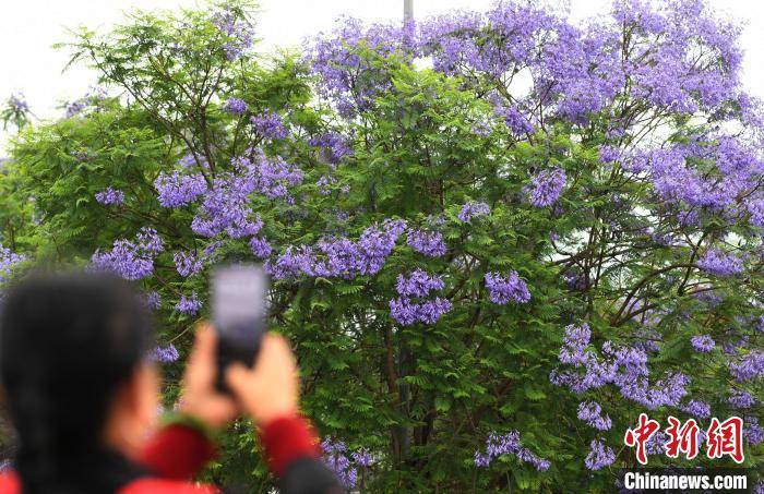 5月10日,重庆两江新区庐山大道公路两旁的蓝花楹绽放,蓝紫色花朵将街道装扮成“梦幻花海”,吸引不少市民驻足欣赏。