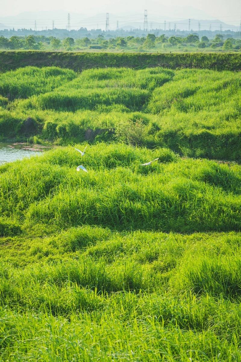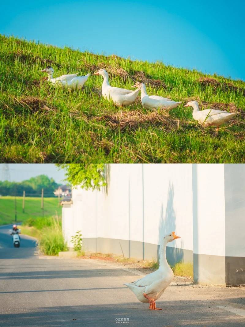 这里环境真的很好,苕溪、麦田、堤坝、白鹭、香樟树,一到这整个人都放松了。乡村道路旁,河水清澈见底,水上绿植繁茂,小溪上空白鹭飞舞……行走其间,一幅幅乡村美景呈现在眼前。老樟树的台阶下是公路车道,台阶上就是彩虹步道啦,徒步or骑行都很舒适。