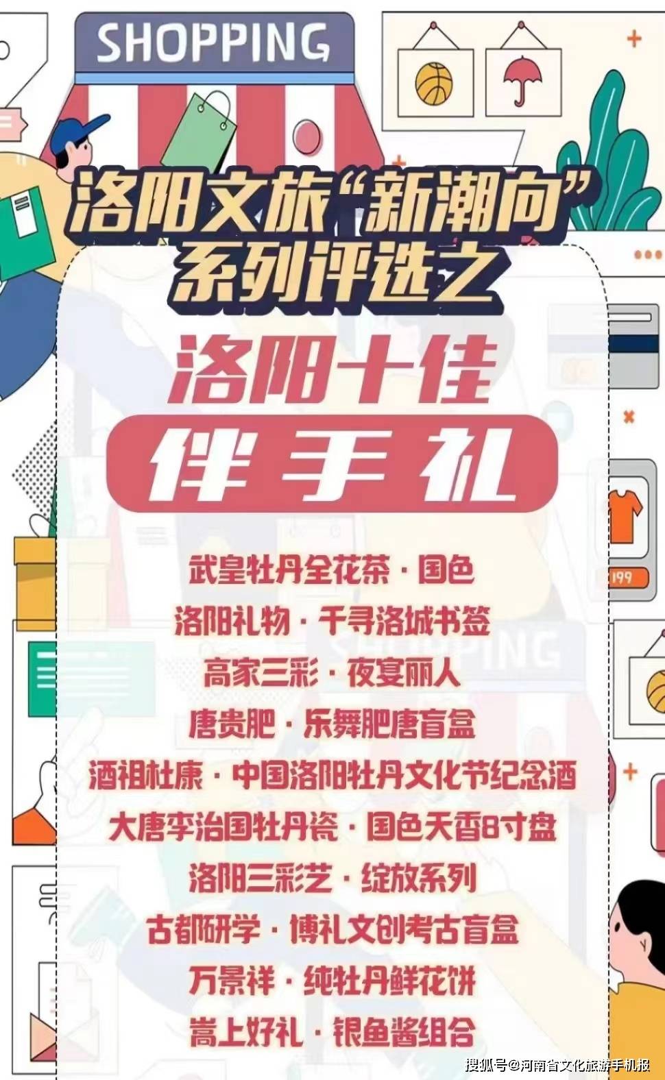 为进一步挖掘市场潜力,促进文化旅游消费,宣传和展示洛阳特色地域文化和产品,推进本地特色品牌建设,洛阳市文化广电和旅游局、洛阳日报社联合举办了洛阳文旅“新潮向”系列评选活动之洛阳十佳伴手礼评选。日前,40多家企业100多款产品经过选送初审、网上投票、专家评审等多个环节,最终武皇牡丹全花茶·国色、洛阳礼物·千寻洛城书签、高家三彩·夜宴丽人、唐贵肥·乐舞肥唐盲盒、酒祖杜康·中国洛阳牡丹文化节纪念酒、大唐李治国牡丹瓷·国色天香8寸盘、洛阳三彩艺·绽放系列、古都研学·博礼文创考古盲盒、万景祥·纯牡丹鲜花饼、嵩上好礼·银鱼酱组合10款产品入围“洛阳十佳伴手礼”榜单。