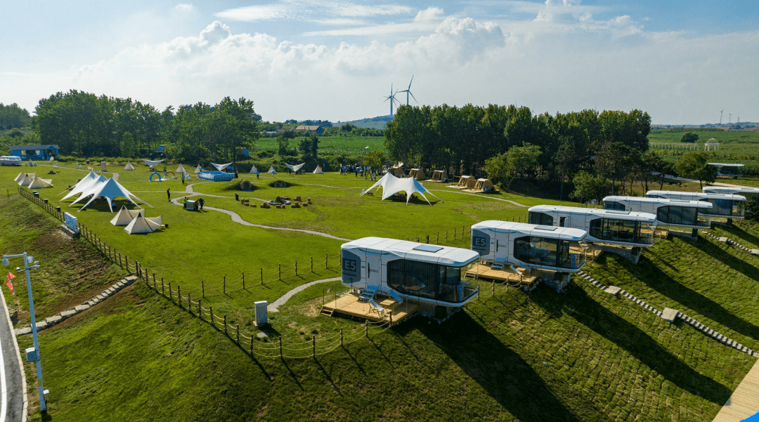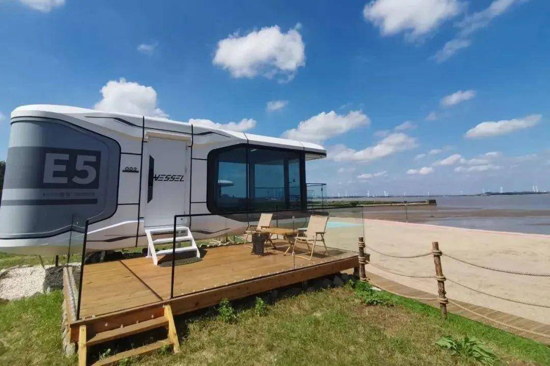 潮汐公社月光营地天然草坪如地毯一样铺在月光海岸 ,明月、海浪、太空舱,邀你共赴一场露营。