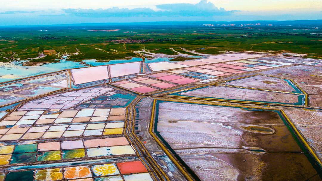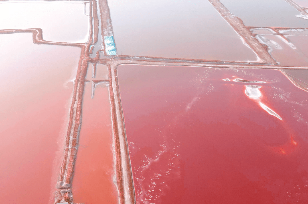 其次,盐湖中的色彩来源于湖里面的生物。盐湖中存在着微生物和藻类,会让盐田在高温和光线的共同作用下呈现出五彩斑斓的颜色,仿佛铺陈在大地上的调色板。据了解,山西运城的盐湖池中就出现过绚丽的玫瑰红色,而出现这样的色彩,与湖水中的矿物质和藻类浓度有关。