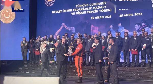 当地时间4月25日,土耳其总统府举行“共和国崇高贡献奖章”颁奖典礼,土总统埃尔多安向参与地震救援的来自多个国家和地区的救援人员颁发奖章。中国救援队行动队队长王墨代表中国救援队受颁该奖章。